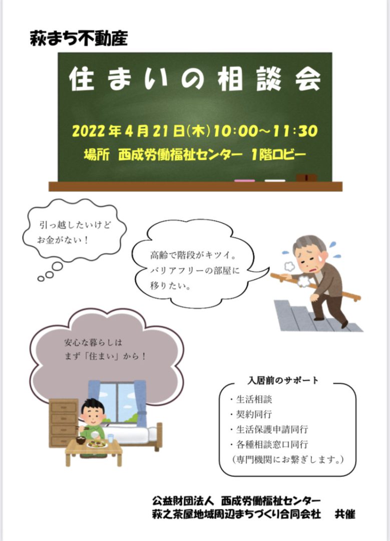 (公財)西成労働福祉センターは、労働者の皆様の住まいに関する相談を充実するため、萩之茶屋地域周辺まちづくり合同会社との共催で「住まいの相談会」を実施致します。萩まち不動産(運営: 萩之茶屋地域周辺まちづくり合同会社)は、大阪府の指定を受けた「居住支援法人」として、住まい探しのサポート(入居前後の生活相談、契約同行、各種相談窓口同行等)を実施しています。